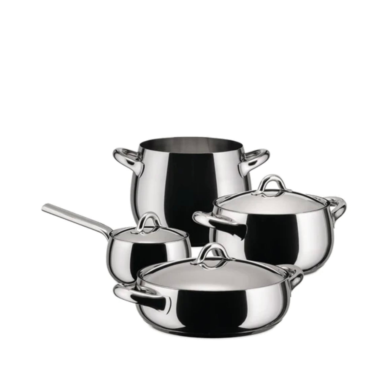 Le pentole della collezione Mami, create da Stefano Giovannoni, sono un inno alla forme morbide e panciute degli utensili della tradizione italiana da cui si diffondevano per la casa i golosi profumi del pranzo della domenica. Il set di pentole Mami è realizzato in acciaio inossidabile 18/10, con finitura lucida.