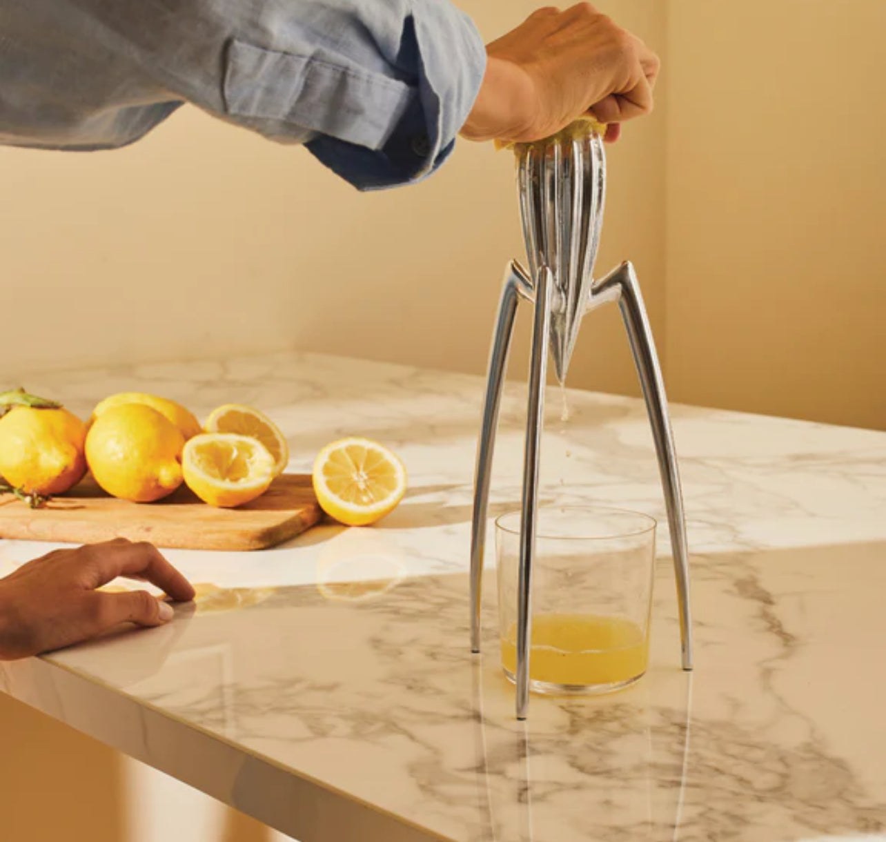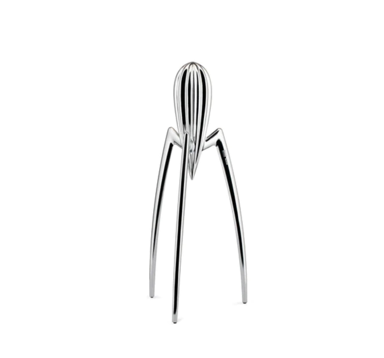 Juicy Salif, l'icona di design per eccellenza e spremiagrumi di design rivoluzionario ma sorprendentemente funzionale. Delineato nei suoi tratti essenziali da Philippe Starck durante una vacanza al mare, in Italia, su una tovaglietta da pizzeria. Onnipresente nelle case di tutto il mondo, e esibito nei musei più prestigiosi del panorama mondiale, Juicy Salif è ben più di un semplice spremiagrumi: è ormai diventato un'icona del design industriale internazionale.